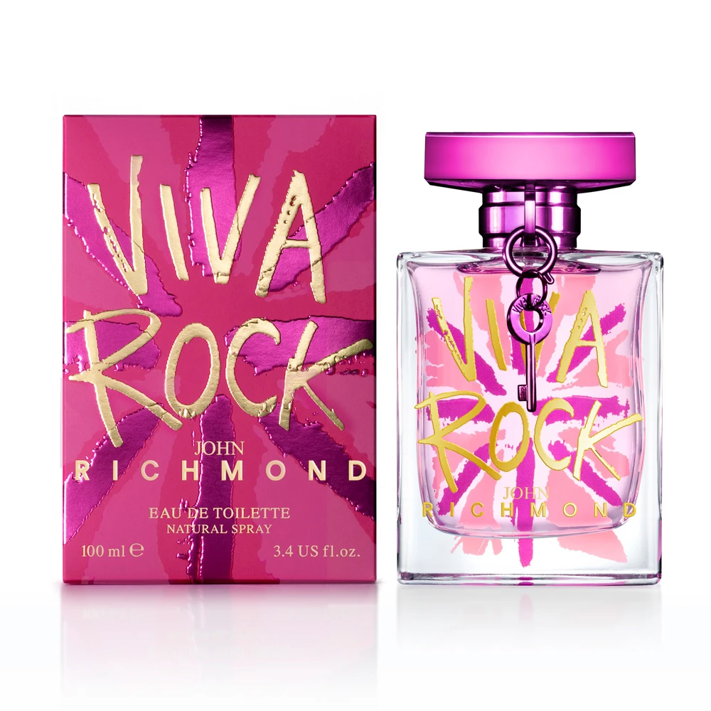 L’impatto con il “Richmond’s world” inizia dal flacone in vetro che è un’esplosione di vitalità, colori vibranti, creatività. Il rosa metallizzato, che connota anche il tappo, e le striature mat evocano una femminilità decisa e vivace, il logo in oro stampato sul cristallo è la firma dello stilista, un piccolo charm a forma di chiave crea un legame “segreto” con colei che indosserà questo profumo. Estremo tratto distintivo è la Union Jack, la bandiera inglese, posta sul retro, che da sempre ispira John Richmond nelle sue creazioni. A questo tripudio di simbolismi e energia non potevano che corrispondere accordi super femminili, esplosivi e decisi che immediatamente vogliono riportare al lato rock’n roll della donna Richmond. Le note di testa di Viva Rock sono quelle di carambola e mandarino siciliano con un inaspettato tocco di cactus sono la parte più “aggressive”, che si scioglie in un cuore di rosa damascena, gelsomino e fiori di ciliegio, rivelando il suo lato più femminile. Il fondo? Sofisticato ma mosso: musk, ambra e iris che lasciano un segno indelebile.